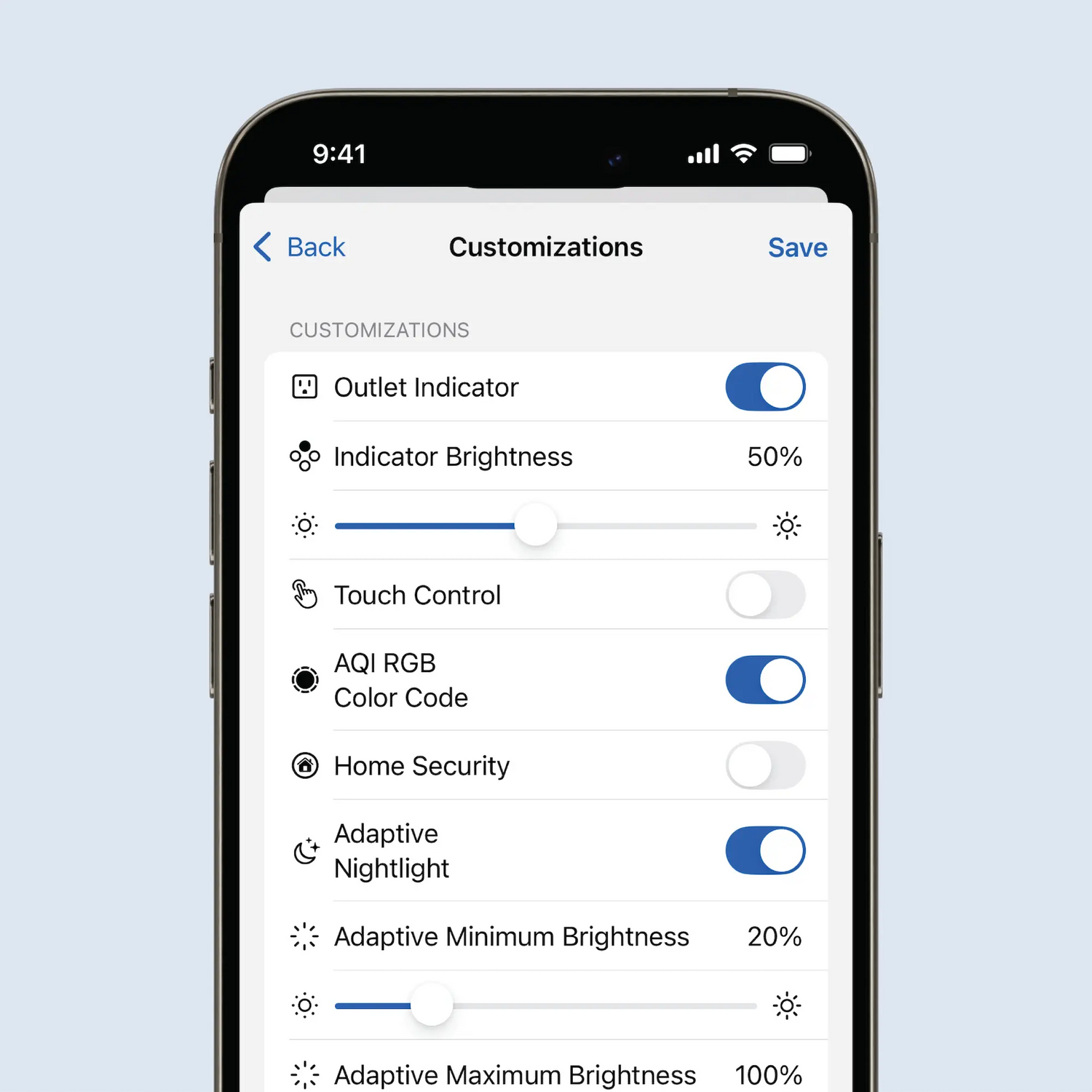 Make InvisOutlet truly yours with customizable settings—adjust the adaptive nightlight, touch controls, indicator brightness, and more.