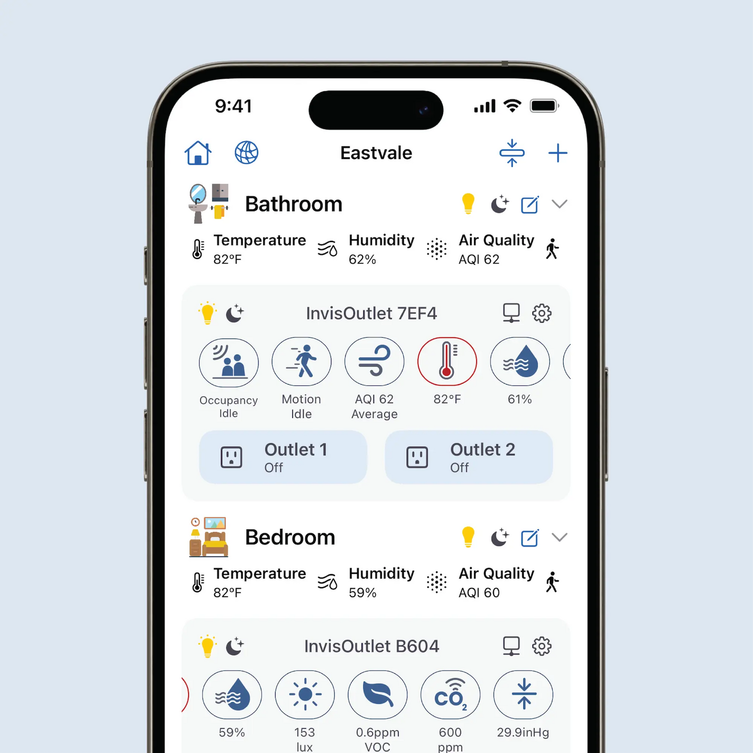 See the status of every room the moment you open the InvisHome app. Monitor multiple homes and organize your InvisOutlets by room.