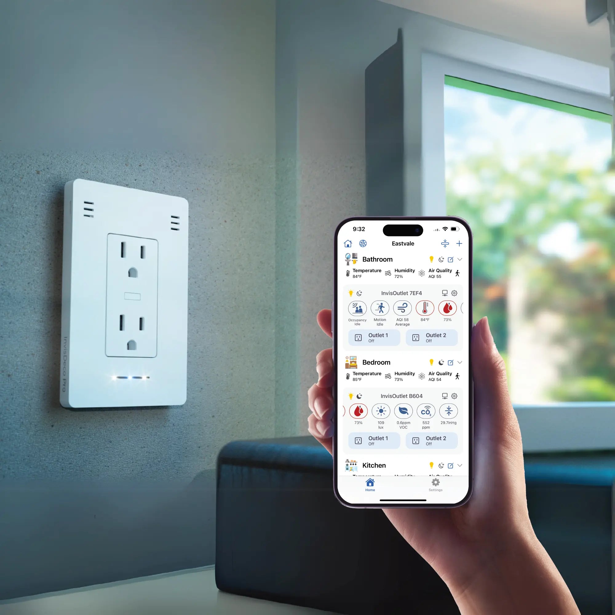Always breathe clean air with accurate measurements of CO2, VOC, and AQI (Air Quality Index) with InvisOutlet Pro's air quality sensor.